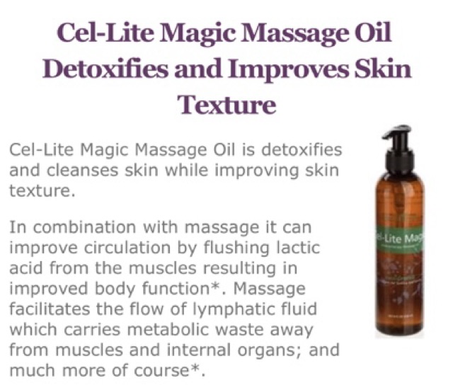 Cel Lite Magic Massage Oil Cel Lite Magic Massage Oil - Grapefruit essential oil benefits skin texture and juniper essential oil helps detoxify and cleanse skin.